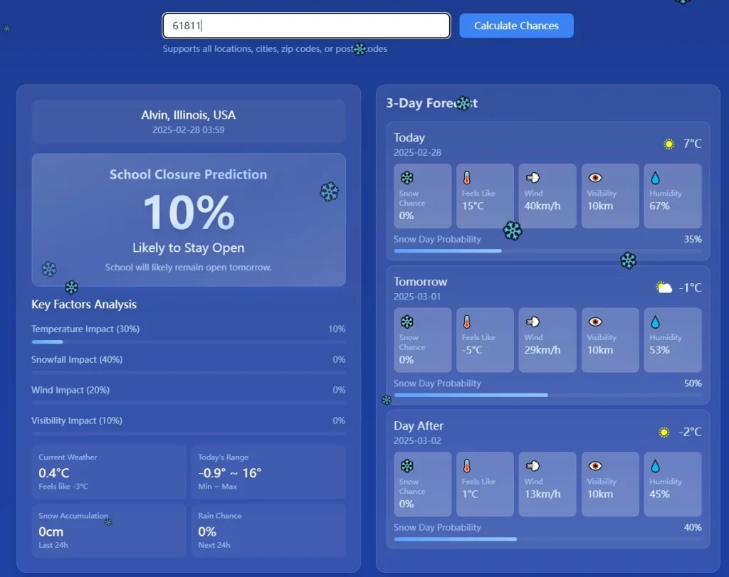 Our Snow Day Calculator uses advanced algorithms and real-time weather data to provide highly accurate predictions. It analyzes multiple factors including temperature, snowfall amounts, wind speeds, and visibility conditions to calculate the probability of school closures. While no prediction is 100% certain, our calculator has proven to be a reliable tool for anticipating snow days.